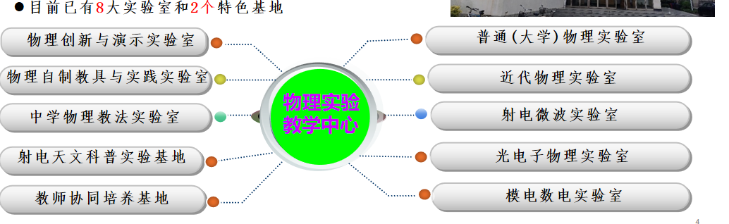 物理实验教学示范中心现有6个专门实验室,包括普通(大学)物理实验室,近代物理实验室,光电子物理实验室,中教法实验室,物理创新演示实验室,模电数电实验室。